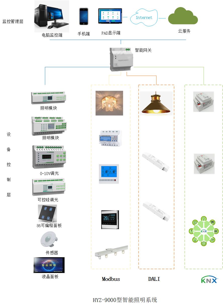 HYZ-9000智能照明系统可通过控制面板、人体感应、照度感应、微波感应、上位机系统触摸屏、手机、平板端等多种控制终端实现灵活多样的智能化控制,广泛应用于各类智能家居、医院、学校、酒店,以及体育场所、机场、隧道、车站等大型公建项目的照明系统。 智能照明系统有总线式和KNX式架构,智能控器逻辑可图形化编程组态,通过服务可以远程监控和调试项目,同时智能照明系统融合了以太网、RS485、KNX、DALI等通信技术,对建筑用电终端实现智能化自动化控制。