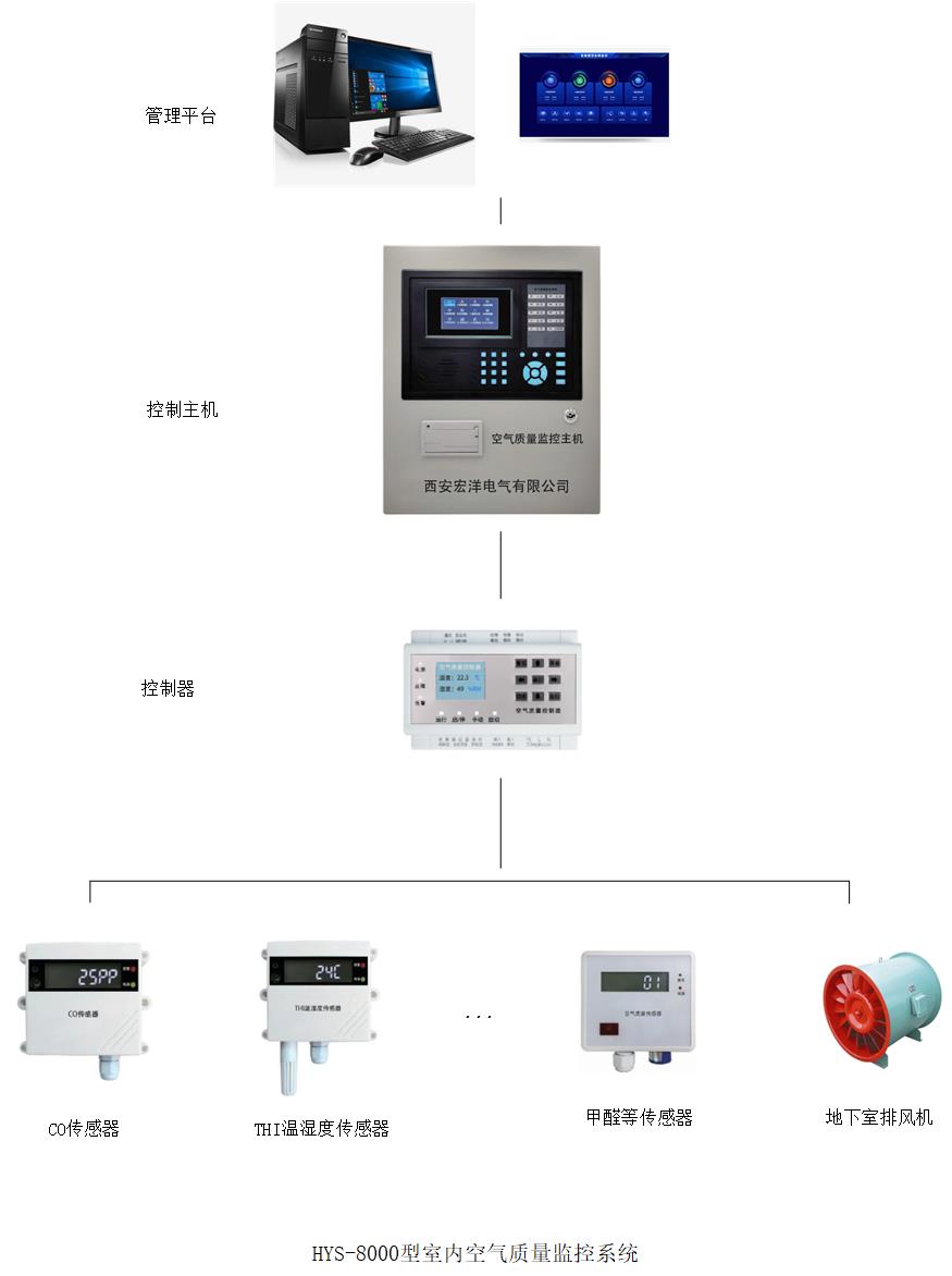 1. 在地下车库设置CO传感器,温湿度传感器;在人员密集或密闭的区域设置CO2,甲醛(HCHO),PM2.5或者多合一传感器等,传感器以总线方式接入空气质量控制器;